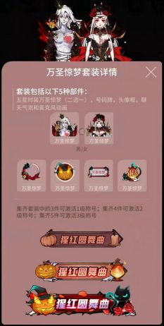 收集万圣惊梦套装可激活称号,套装包括【号码牌,聊天气泡,麦克风动画,头像框,时装】