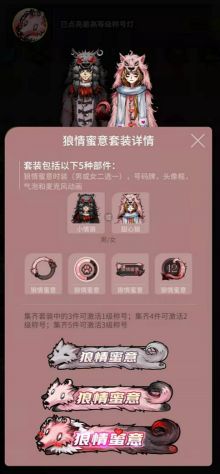 我想其中最受人欢迎的还是要数套装系列了吧,前期的箱子都不贵,还能够获得不同的装饰品,最最重要的是当你收集的部件达到一定的数量以后还可以获得称号哟(^U^)ノ~同时还可以通过做任务获得宝箱,开启就有一定几率获得部件,所以不管是氪金党还是白嫖党都会愿意去怼套装系列哒~那么今天就带大家来看看这一套【浪情蜜意】吧!
