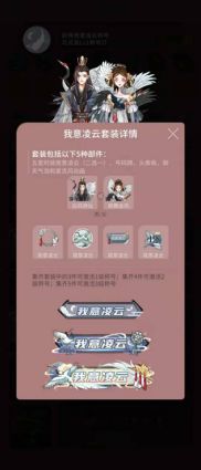 我想其中最受人欢迎的还是要数套装系列了吧,前期的箱子都不贵,还能够获得不同的装饰品,最最重要的是当你收集的部件达到一定的数量以后还可以获得称号哟(^U^)ノ~同时还可以通过做任务获得宝箱,开启就有一定几率获得部件,所以不管是氪金党还是白嫖党都会愿意去怼套装系列哒~那么今天就带大家来看看这一套【我意凌云】吧!