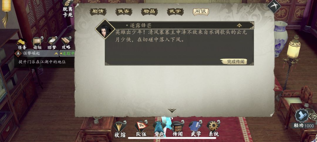 门派已经建立完了,现在卡在提升 强势崛起 提升门派地位这里, 清风寨也全去了,山贼 和 寨主都打了,传闻里面 闲谈里也显示了,但回到山庄 文伯一直提示让小心,崩溃了,安妹子也招了,支线也全做完了。这是什么鬼 废了?