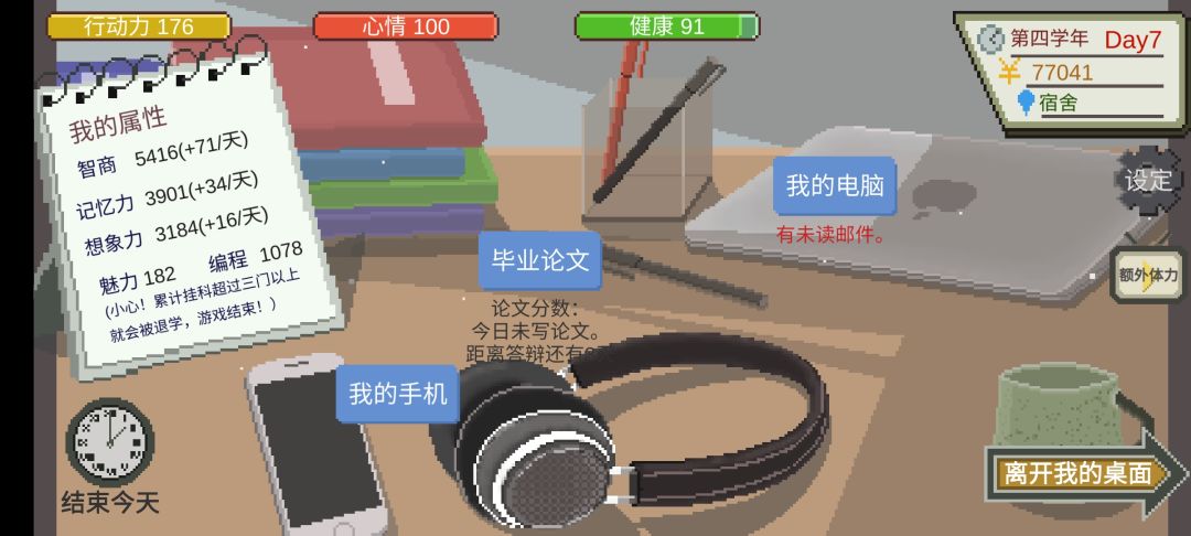 刚开始大一起码需要去培训三次以上,每天学习的时间控制在三次,没必要选学分高的课程 (跟后面的百万下载量比起来多的那点学分就是毛毛雨),尽早刷编程点数,越高越好,然后就重要的一点来了,做插件就可以了,性价比最高的一个项目,钱跟下载量跟游戏区别几乎没有,难度几何倍数的降低,越早开发出项目越好,后期基本财务自由,想买啥买啥。