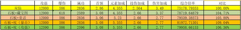 由于双仙需要上天狗,探险系列魂卡位置会多上一张杜门的收益。而童话由于需要叠层,计算为87.5元素加成,实际会高一点,跟暴击石板+攻强杖的洗法55开吧。