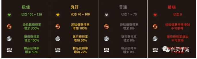 1)状态分为战斗状态和生活状态2种。 2)状态按数值分为4种。 - 非常好/良好/普通/糟糕 3)经验值/银币/道具的获得概率根据战斗状态有所不同。 ① 根据不同的战斗状态,角色适用的效果不同。 ② 战斗状态为0(糟糕)的情况下,无法通过狩猎获得经验值/银币/道具。♠ 即使状态数值为0,也可以获得副本/任务完成奖励,以及野外的宝箱。