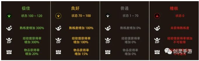 2.状态:1)状态分为战斗状态和生活状态2种。 2)状态按数值分为4种。 - 非常好/良好/普通/糟糕 3)经验值/银币/道具的获得概率根据战斗状态有所不同。 ① 根据不同的战斗状态,角色适用的效果不同。 ② 战斗状态为0(糟糕)的情况下,无法通过狩猎获得经验值/银币/道具。♠ 即使状态数值为0,也可以获得副本/任务完成奖励,以及野外的宝箱。2.状态:1)状态分为战斗状态和生活状态2种。 2)状态按数值分为4种。 - 非常好/良好/普通/糟糕 3)经验值/银币/道具的获得概率根据战斗状态有所不同。 ① 根据不同的战斗状态,角色适用的效果不同。 ② 战斗状态为0(糟糕)的情况下,无法通过狩猎获得经验值/银币/道具。♠ 即使状态数值为0,也可以获得副本/任务完成奖励,以及野外的宝箱。