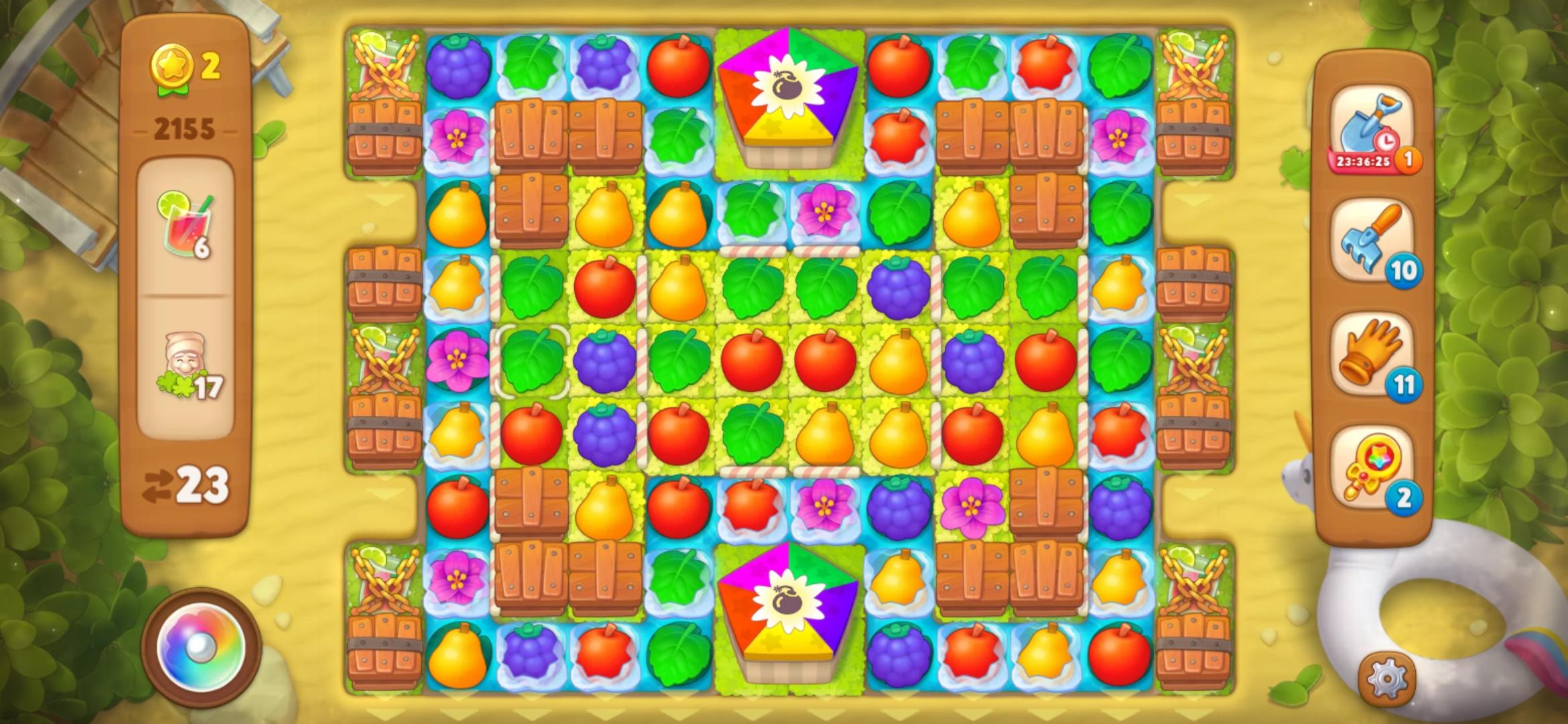 如果可以尽量选择两个彩虹球的全局消除,这样对于全局的障碍都会进行一次消除。但是这个要视情况而定,如果步数比较多的情况下,就可以制造出一个彩虹球之后,再等一下,然后去尽力制造相连的彩虹球,如果步数少的话,就尽量还是用单个的彩虹球,这个视情况而定。