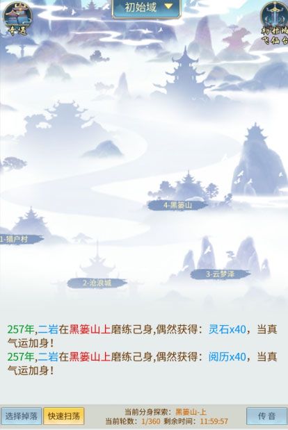 通关一个小区域后可以进行扫荡,每次扫荡最多持续12个小时,可获得灵石、灵府材料、炼丹炼器材料等,扫荡途中可以使用上品灵石快速扫荡,也可选择掉落物的品质进行自动卖出。