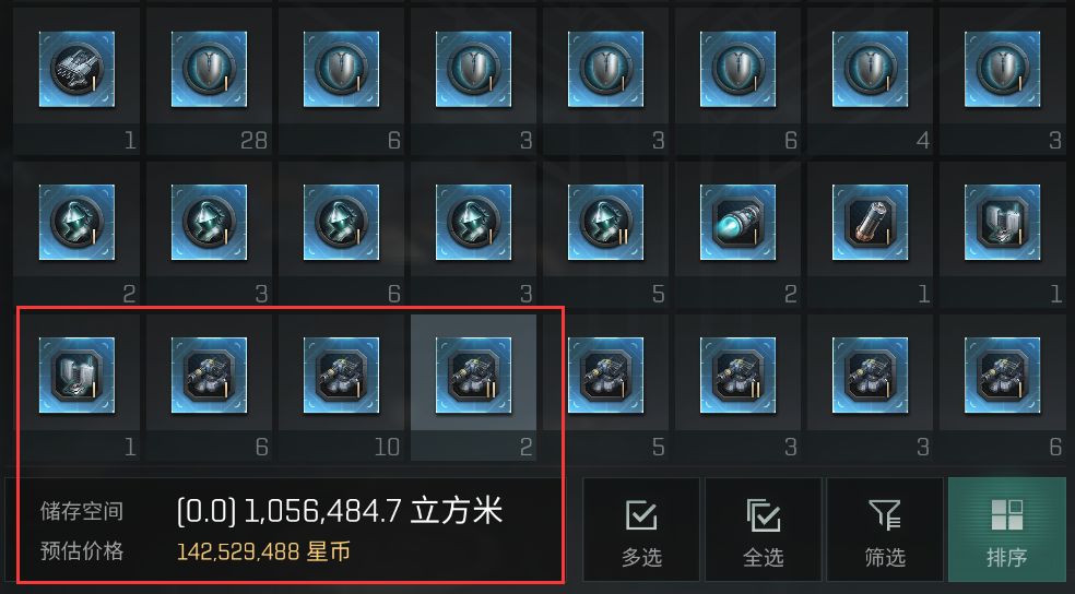 攻坚方面的准备就这些,除此之外还要预备有额外的截击,当截击在收割作战的过程中损毁至1艘时,就应当考虑撤退了,毕竟能够确保安全的将战利品带回基地的只有截击,类似于船插蓝图一类的体积小、高价值的货物应当优先让截击携带(见下图),其余的大型装备由舰队成员拾取,这样在发生战损时,丢失的也只是一小部分战利品,不至于过于心痛。