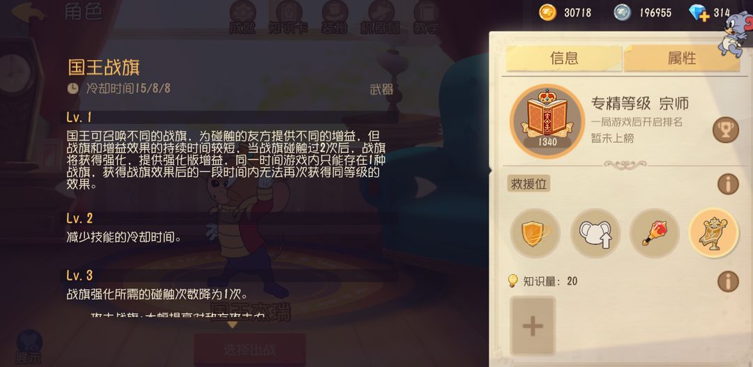 攻击、救援、防御、感知、灵巧,不得不说国王杰瑞的第二个武器技能“国王战旗”所能提供的增益还是十分全面的,这让国王杰瑞在游戏中容错性和实用性大大提高,哪个队友会不喜欢这样的辅助呢?