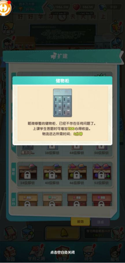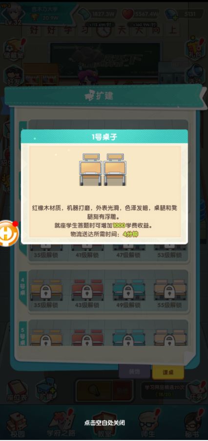 作为挂机放置类游戏,前期的主要玩法是在教室中通过挂机来获得大量资源(学费、心得),从而为学校逐步发展提供支持。