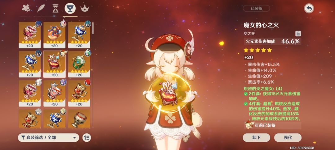 可莉所有的伤害都是火元素伤害并且现阶段主打增幅反应,因此 现阶段魔女套可以说是最契合可莉的圣遗物,这基本没什么争议
