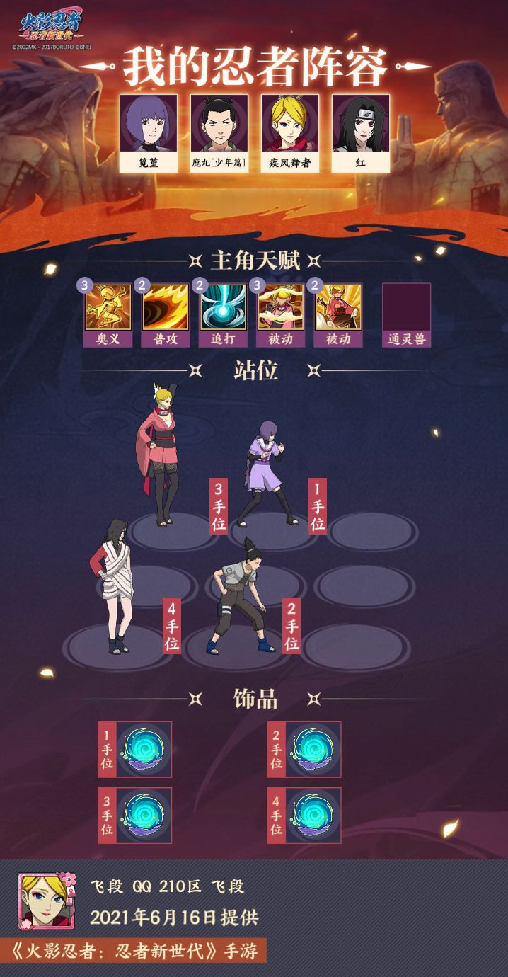 疾风大舅和天藏是前期活动必得的忍者,获取难度低,有打断有免控,是很好用的阵容,第三个忍者可以选择当期限定或者活动忍者,也可以选择汉和飞燕阿斯玛这种前期博人传活动必备的忍者自由变换阵容,输出也不低。