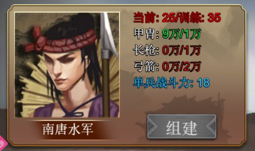 先看看新兵种南唐水军,需要一种3级武器,其他都是一级武器。训练度非常的低就可以组建了。单兵能力堪比3级火炮兵。但是历史模式下低训练度会减攻击力和攻击回合数所以还是尽量提高训练度之后才进攻别的国家吧。