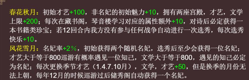 比起经济和军事的困难,后宫就是李煜的福利技能了。大于800才艺之后必获得一个名妃。而且才艺每次换季都会自动累加50给各位。不到几年你就可以拥有很多很多的名妃~