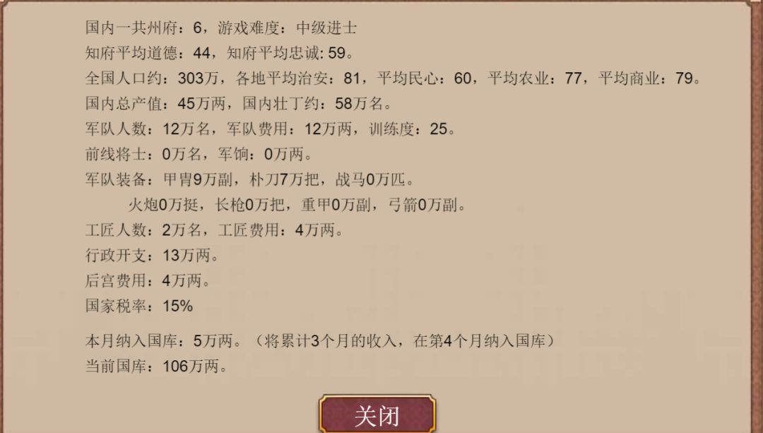 经济方面,比起前面的宋太宗等人作为一张白卡。他的经济实在是捉襟见肘。历史模式下只有6座城池。初始国库还要-20W银两。而且因为换季无法上朝所以税率是无法增加的(这个必须注意)。所以前期多贸易和如何运用策卡来解决经济困境是第一个好玩之处。