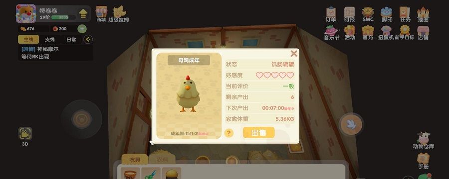 小鸡刚出来的时候属于幼崽,隔个若干个小时之后,就会变成母鸡,变成母鸡后就可以产出鸡蛋了,此时可以点击这个小鸡,然后查看它的成熟期究竟是多少。在小鸡的幼仔期时,需要用稻米来喂养。稻米在完成建造家禽小屋时会奖励一些,后续可以前往尤尤那里购买稻米。等到小鸡长大成为了母鸡,来到篱舍里面,这时就可以采集得到鸡蛋了。点击母鸡可以查看下蛋的时间,以方便你能够继续采集。基本上在投喂完稻米之后,就可以离线不用管小鸡了,等它们自己成长即可。等待两个小时后,再次上线就可以收获到鸡蛋了。