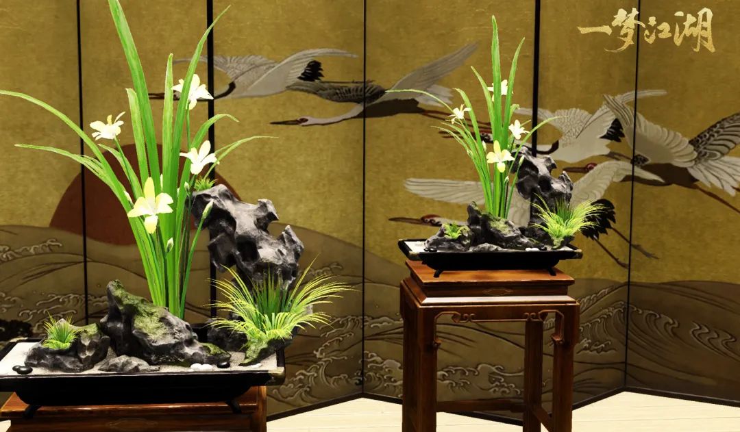 豆蔻初发,菖蒲晚开。弟子们将这两种不同时节的草木融汇于同一家具景致中,制造成了一盏新灯。