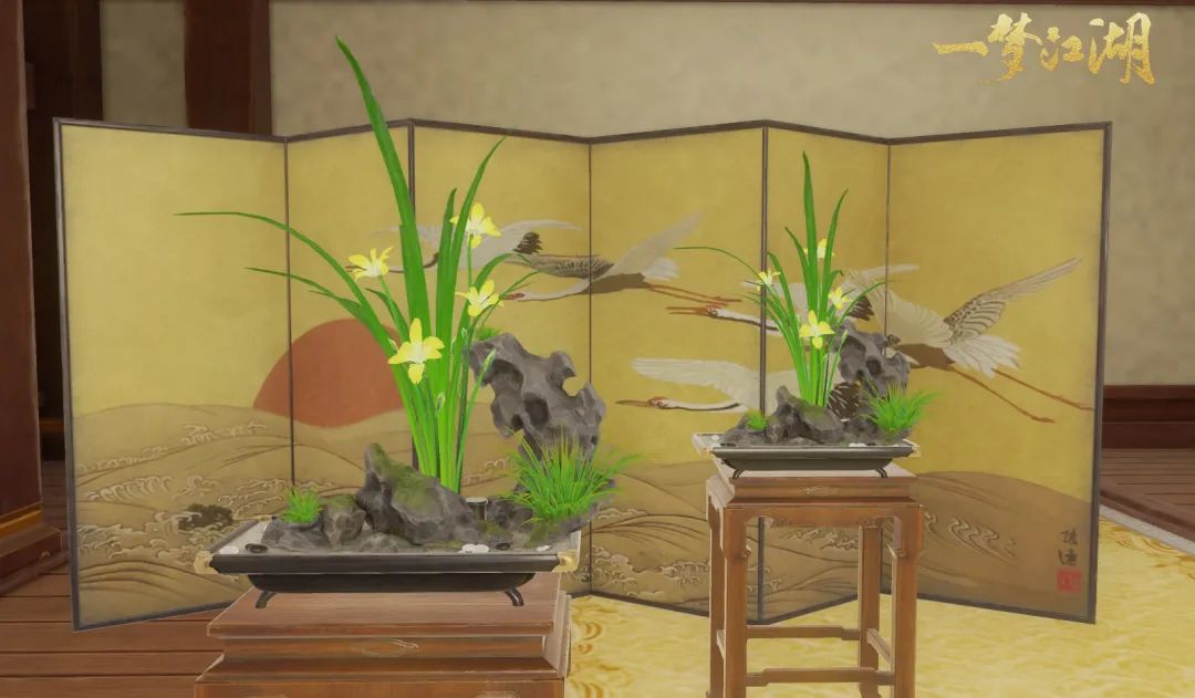 将刚刚抽枝的新芽比作高大的乔木,点缀鲜嫩可爱的小黄花,再配上乱石假山,看似随意地摆放,却能将芳草柔美舒展的姿态和湖石巧妙融合,清新怡然!