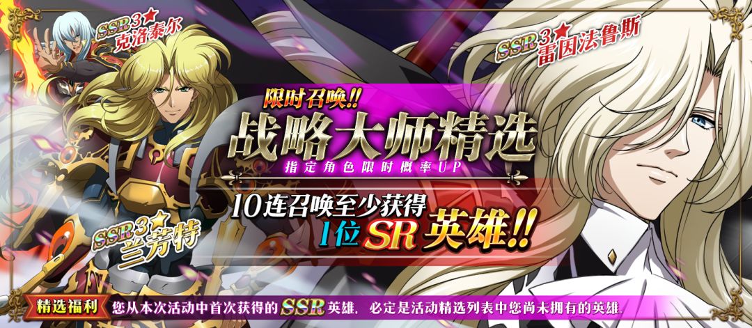 限时召唤「战略大师精选」中SSR级英雄克洛泰尔、兰芳特、雷因法鲁斯出现概率提升!