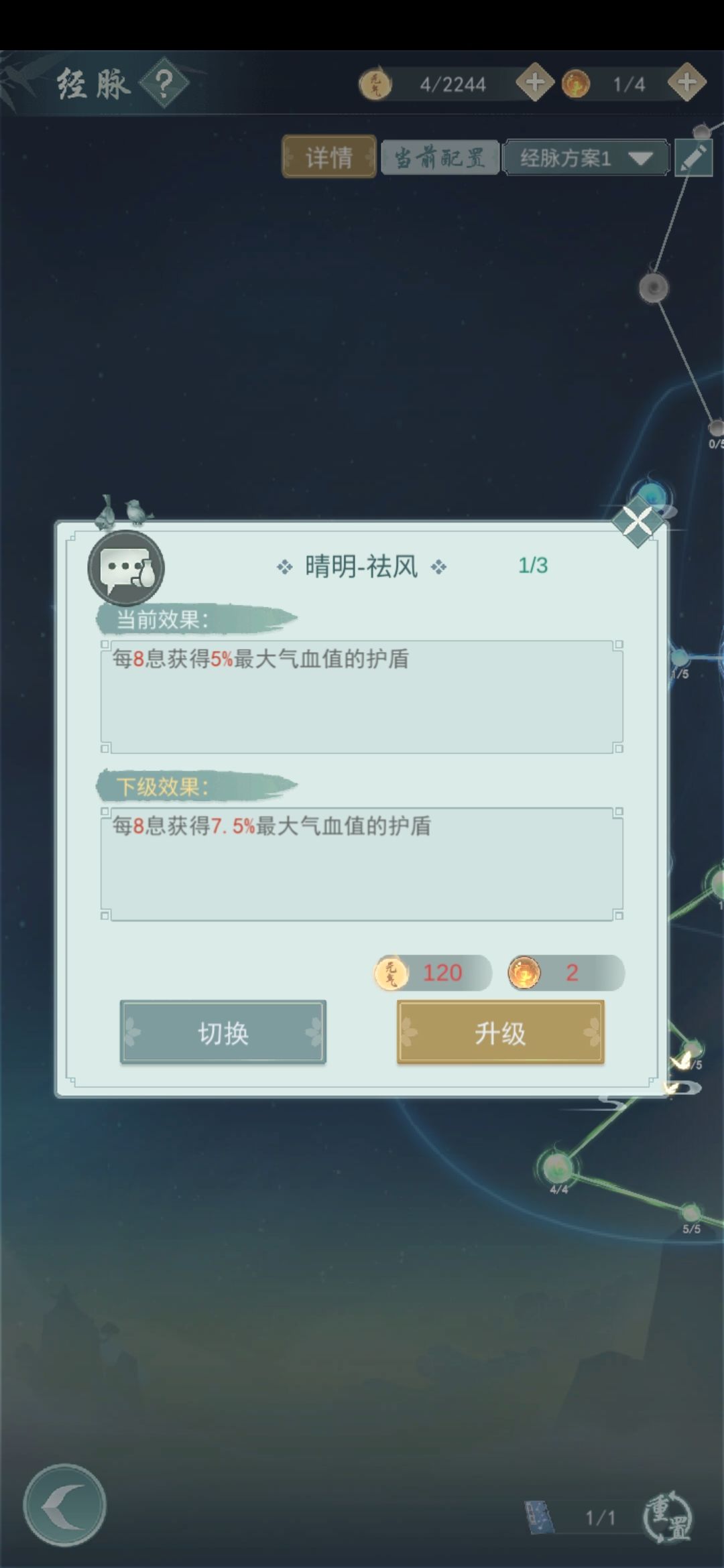 黄脉,和绿脉的最终穴位点一级就够了,有多余的当然也可以点满,追求完美的小伙伴,甚至可以点满红脉中4个加暴击的穴位,一共可以提高自己14.8%的暴击率,给烟雨兰铺路,当然这建立在自己有多余的元气。