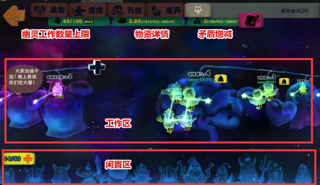 闲置区上限可以用钻石买,目前上限30,往上不能买了。工作区所有打工仔数量加一起(包括团长)最多100。打工仔数量超过30就会爆发矛盾,积累到一定程度(没试过多少)打工仔会随机离开。物资是维持部门的根本,部门少时候消耗没算过,部门多的话会平均成每个部门消耗6/H。物资小于0时每次进入幽灵界面会随机拆一个部门,该部门内幽灵回归闲置区。