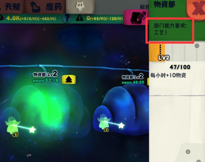 二、再尽量抓工艺30+(不到30可用30-放一起达到30+,遇到30+再把30-遣散)建物资部(此时为2级物资部,性价比最高,单个部门消耗6,2级物资增加10,并且一个幽灵就能撑起一个2级物资部,高级物资部需要幽灵数量多,并且物资增长提升不大);
