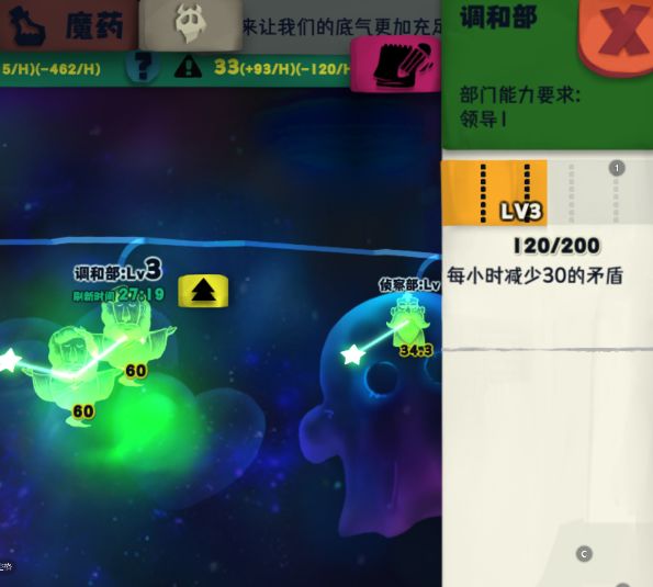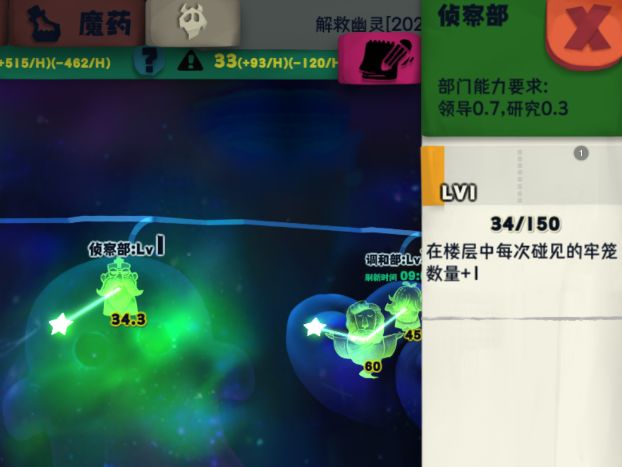 部门对幽灵的要求有三种,团长属性和部门对应单属性要求、双属性要求。领导决定团长可以管理多少打工仔,所以团长的领导属性尽量要高,每多一个团长就多1点不必要的矛盾值。领导与部门数量无关,与包括自己在内的本团打工仔数量有关。