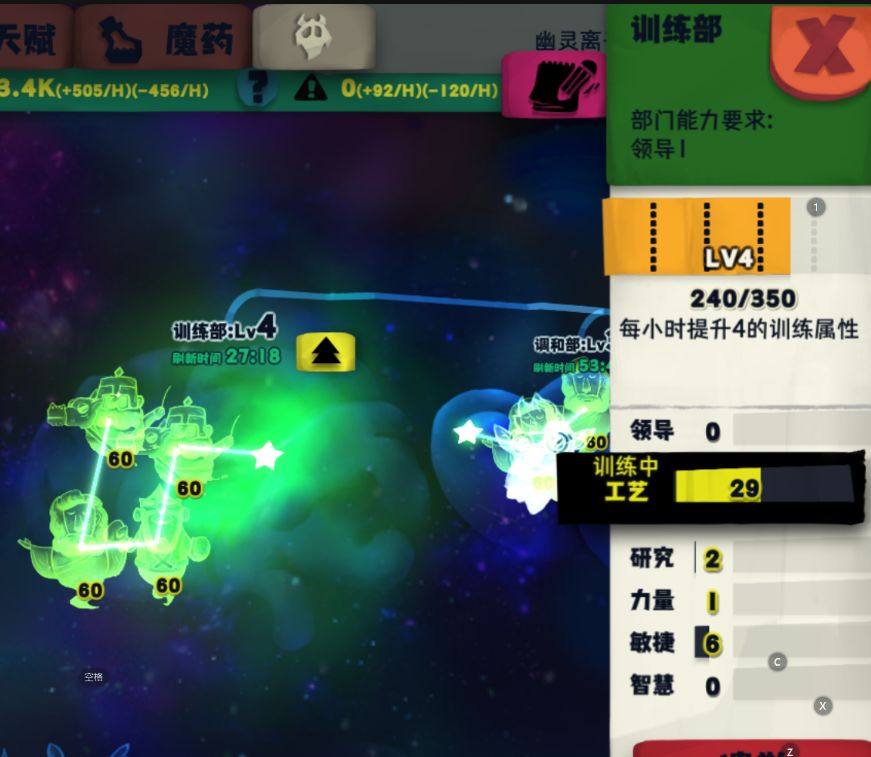 说到建部门就必须来说一下幽灵的属性和各部门对幽灵的要求了。幽灵分为1-5级(普通)和传奇级(6级),有领导、工艺、研究、力量、敏捷、智力六维属性,六维属性总和=等级X10,六维属性总和<等级X10的情况下可以通过训练部来提升任意属性。最重要的一点:幽灵只能训练属性不会升级!幽灵只能训练属性不会升级!幽灵只能训练属性不会升级!重要的事情说三遍。