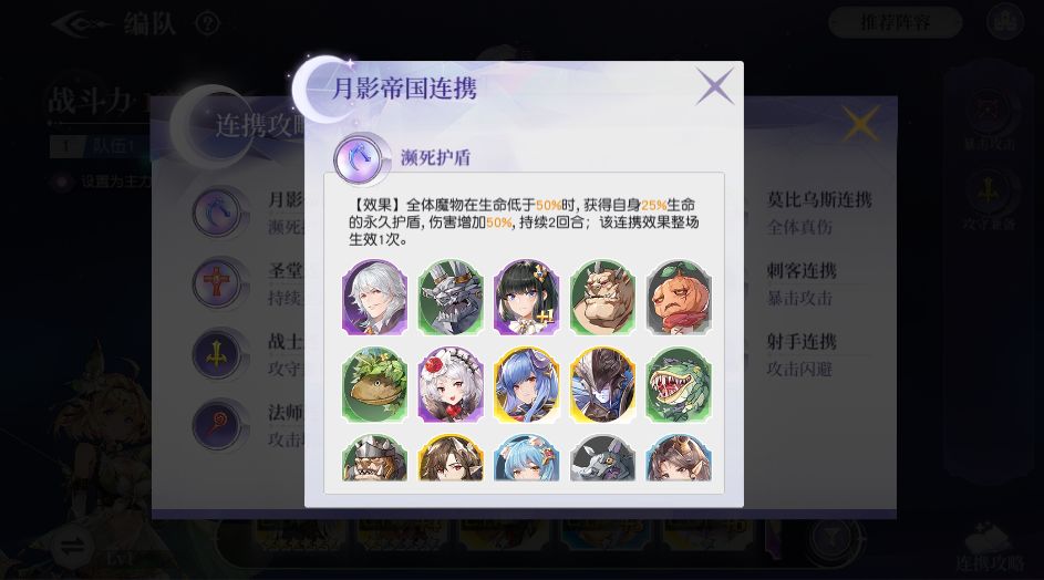 在《月神的迷宫》中,阵容搭配的核心机制在于“连携”。魔物们归属于不同的职业和阵营,当上阵魔物具有3个相同职业或5个相同阵营时,就会激发特殊的连携效果,为全体魔物带来强大的增益。比如当上阵的5名魔物都属于月影帝国阵营时,将触发月影帝国连携,使得全体魔物在生命低于50%时,获得自身25%生命的永久护盾,伤害增加50%,持续2回合;该连携效果整场生效1次。
