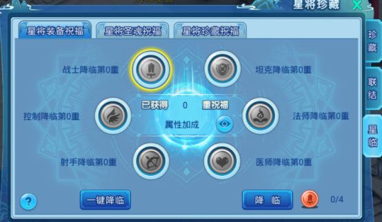 每5重祝福需要提升1阶全部星将珍藏,例如:全部星将珍藏是0阶,可以获得0-5重祝福以此类推。