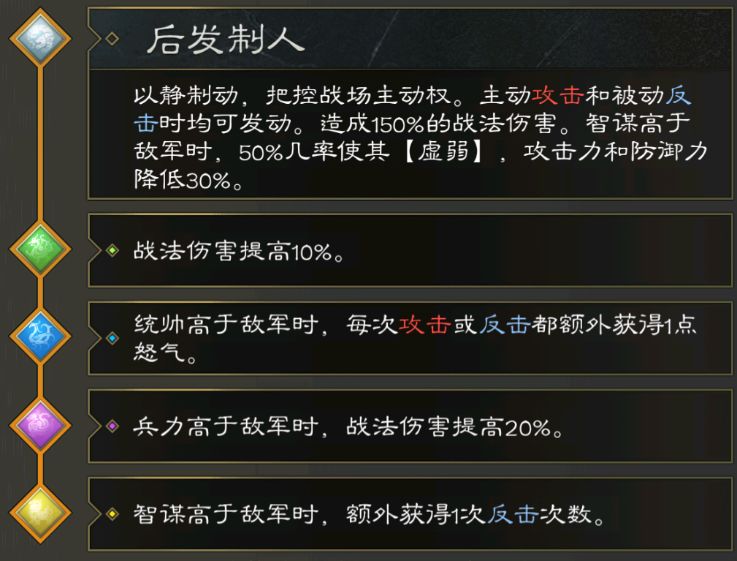 养由基输出流——弓手的身板本省就比较脆,遇到步兵的远反更是一下反击半条命没了,特技主要核心就是抓准时机打出最大化伤害,同时增加赞怒速度,在面对远反时先手打出战法最大化输出同时削弱对方兵力,对于弓兵来说,。进攻就是最好的防御。低基础士气就不带夺势了。