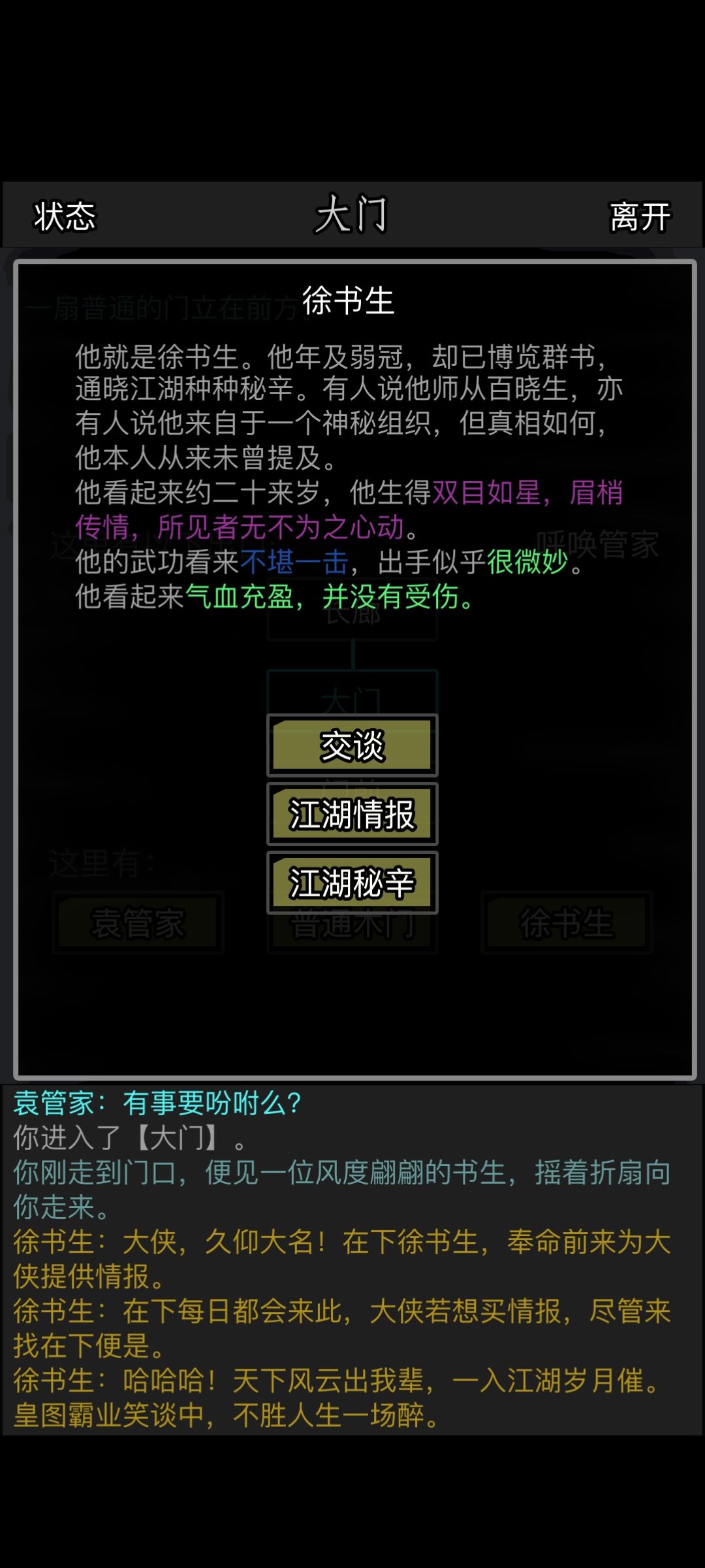 4. 已获得的江湖秘辛永久保留,可以找徐书生进行询问查看,而由于情报是口口相传,故此不能保留查阅,于每天0点,徐书生会带来新一天的情报;