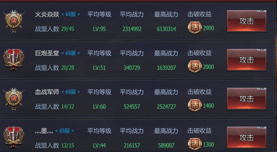 战盟管理者可通过破袭战玩法每天选取3个不同的战盟进行挑战,根据所选择战盟的人数以及平均等级可获得不定量的活跃值。