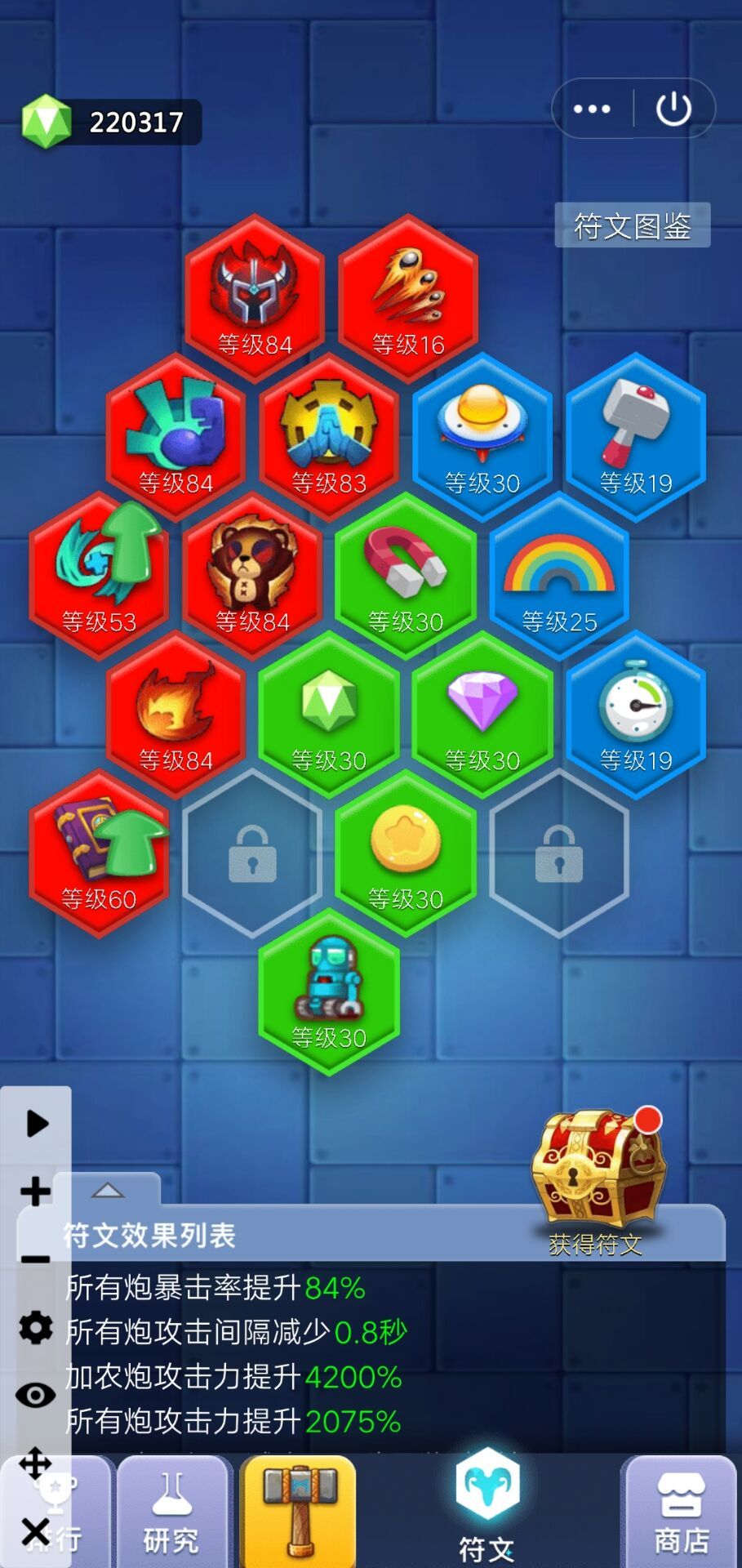 首先是符文,图里≤30级的优先升级,个人推荐敏捷>两个放置>飞碟>俸禄>其它