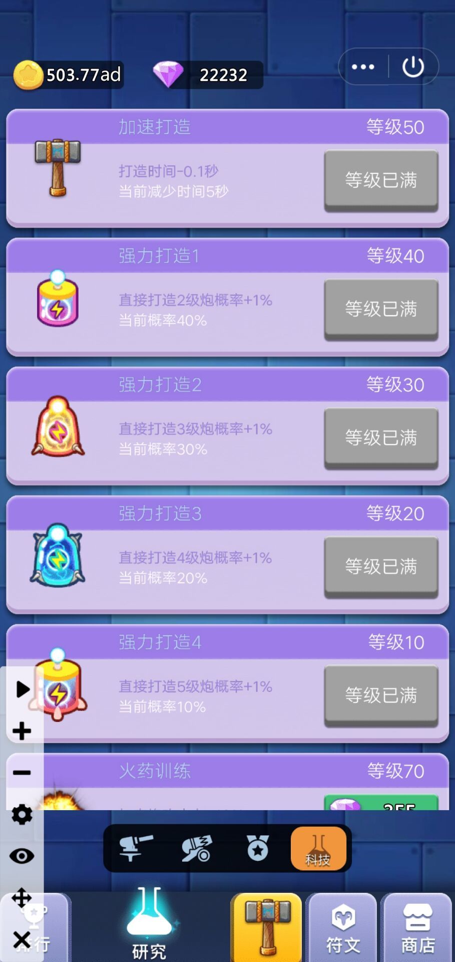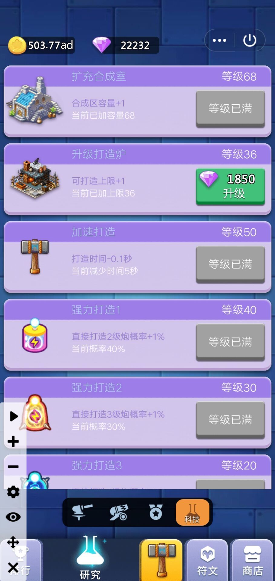 然后是科技,优先升级强力打造1-4,加速打造跟扩充同步升级,大概点两次加速就点一次扩充,不然位置不够会很难受,打造炉不用升级,我是钻石没处花才升的,萌新切记不要升级