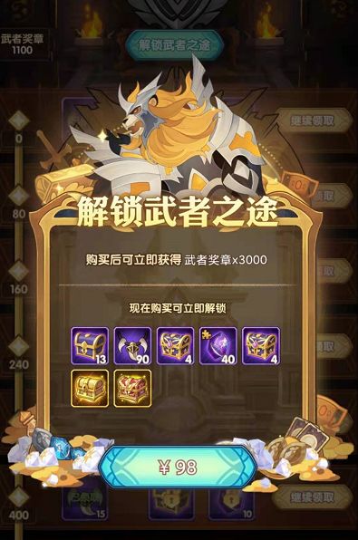 价格98元,左边的武者奖章数量靠上面的每日任务和氪金!
