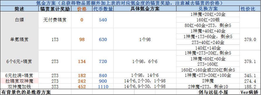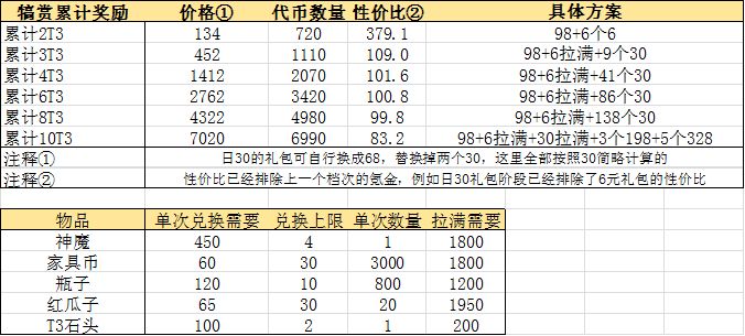 首先是所有累计奖励的对应性价比,后面的性价比部分已经排除了上一个档次