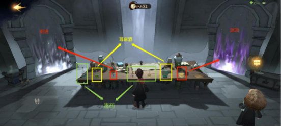 因此想要三星通关,我们只需要先喝下左右两边的荨麻酒,再让哈利喝下右一的黄色药剂,选择通过紫色火焰的门,就能一次解决了。