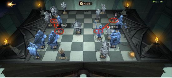 不过在这盘棋中我们本就占优,所以打法也很简单,第一次走我们只需要先牺牲“罗恩”,让对方的皇后棋让开位置,失去对“哈利”的威胁,“哈利”就可以在斜对国王的方位一步将军,至此只需要走两步棋就可以了。