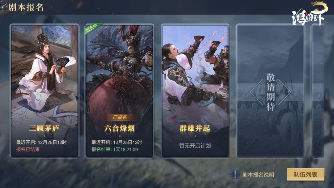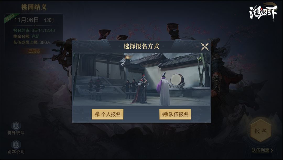 报名时,主公需以小队形式或个人形式进行报名。在备战区中主公可组建小队招募其他主公,所有加入队伍的主公默认报名队长所选剧本,并会分至同一大区,个人报名则无剧本限制,大区分配随机。