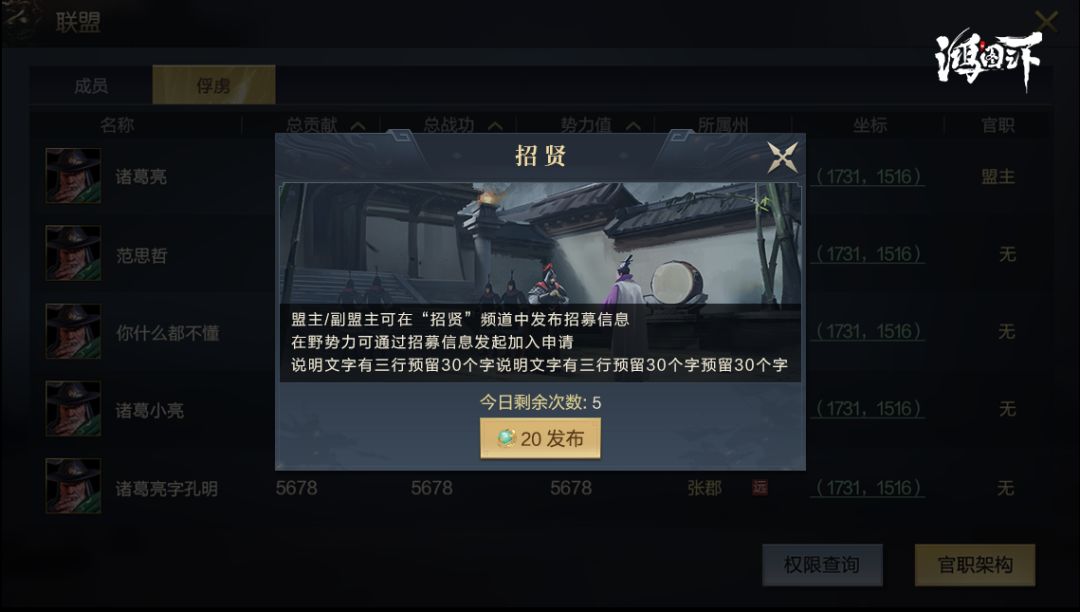 1、新增招贤频道,其余频道不变。2、招贤频道不能主动发言,只能发布联盟邀请和剧本报名邀请。3、招贤发布分为联盟招贤和队伍招贤,用于联盟形式招募或小队伍招募。
