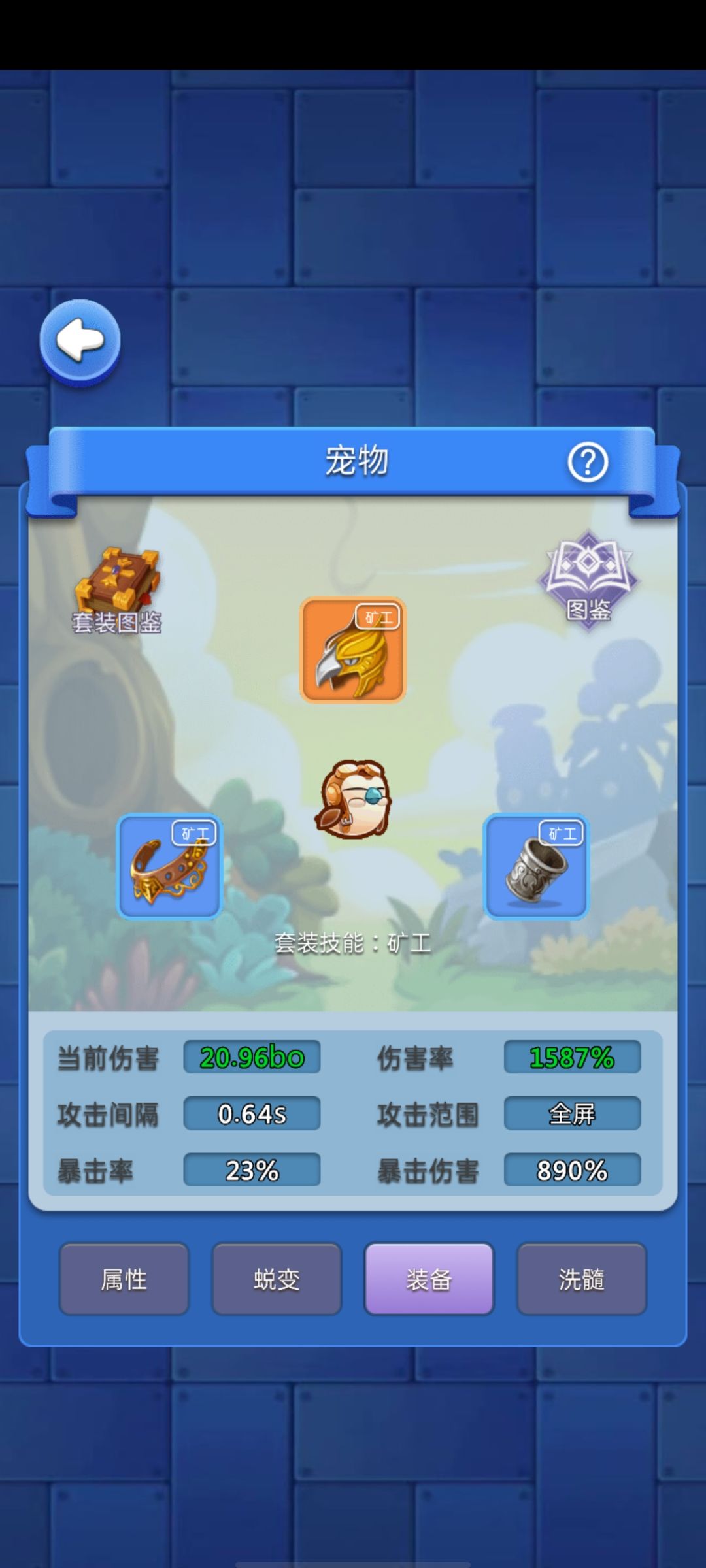 宠物初始1级,前20级就是帮我们打一下怪,没有其他技能;20级后开放蜕变,蜕变后拥有技能;30级后可以游历穿戴装备,装备增加宠物属性,并且套装拥有强大功能;40级开放洗髓,增加宠物伤害率。