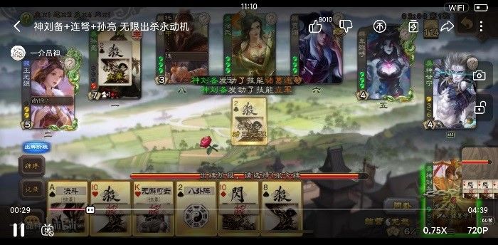 像图片中的吴势力神刘备出杀,然后把杀给孙亮,孙亮再让神刘备摸1张牌,神刘备再杀再摸,周而复始,一回合清场。