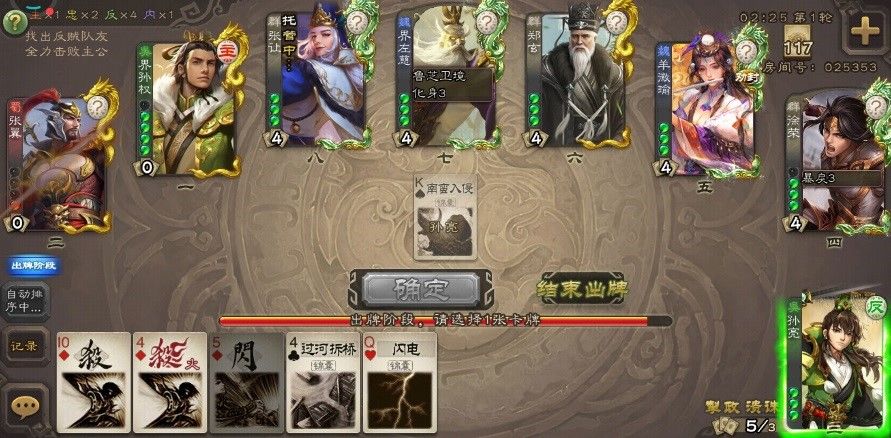 反贼本就人多,占据一定优势,并不一定需要孙亮来进行输出。即使虽然没有爆发能力,但是靠着【溃诛】技能前期可以给己方补牌,有一定的拉牌差能力,后期主忠血量少的时候也能靠【溃诛】补刀。同时【掣政】还可以拆主忠方关键的牌,比如距离、防具等,是比较适合的。