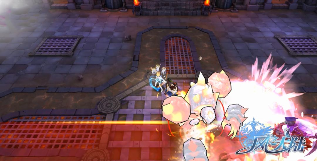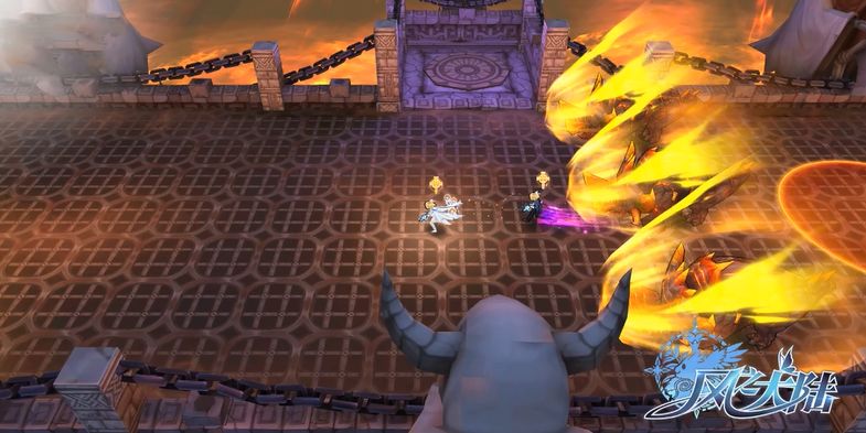 当我们击败炽热菇菇继续深入时,没想到在过桥时中了陷阱——前有不断间断出现火圈预警,后有焰火犀牛追击,而我们只能走位躲过火圈快速向前跑!