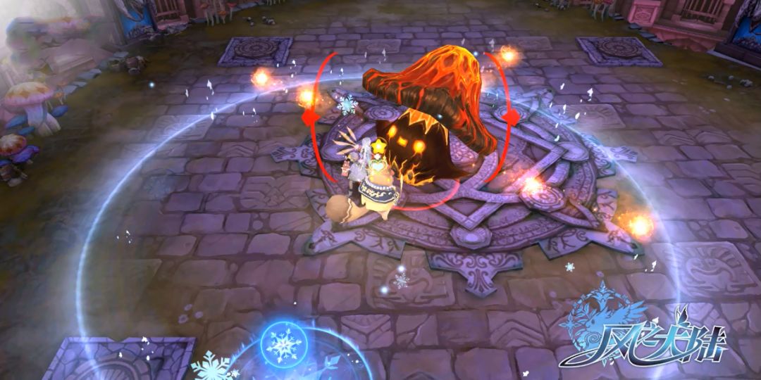 炽热菇菇的扇形技能、环形AOE技能可以依靠配合走位躲避。而它的全屏AOE伤害或环形AOE预警伤害,如果硬扛太勉强,建议在左侧的冰雪能量法阵处,变身成艾希释放冰雪护盾。