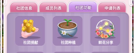 当小花进入【社团功能】时发现,小花的机会来啦~!【社团捐献】可以捐赠金币或者钻石为社团增加社团资金,同时获得个人社团金币,个人金币可以用在【社团种植】里面解锁花盆,花盆可以种植小花已经培育出来的任何鲜花,每产出一朵鲜花可以获得2颗鲜花种子。