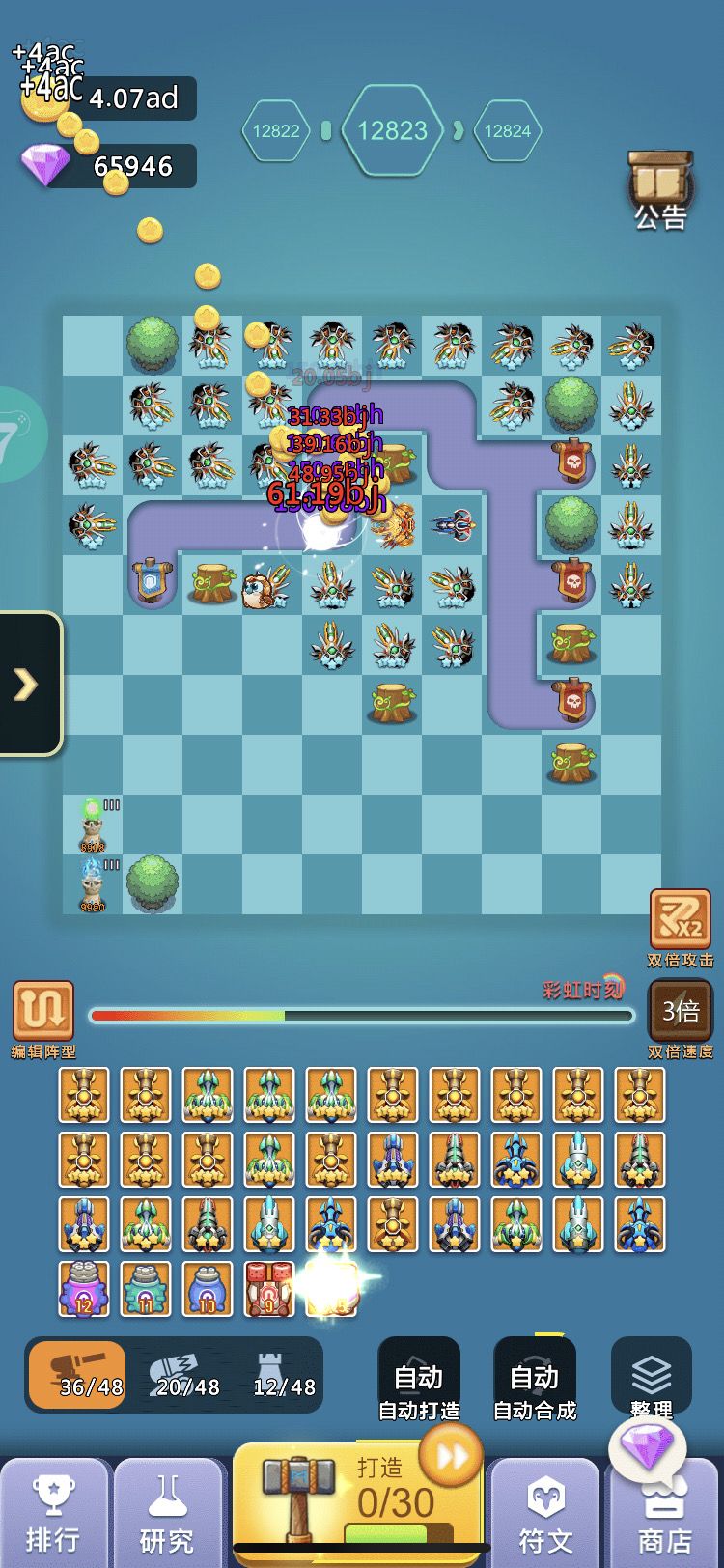 5000关以后基本都是3个出怪口,有饕餮得情况下需要编辑阵型让三个出怪口的怪物只能顺着一条线从其中得一个出关口出来,这样就不会有漏怪的情况发生,简单的说法就是三点一线,就比如我这张图,三个出怪口的怪都只能从右上角这一个口子出去,其次圣光不能摆太多,圣光都摆在怪物堆积后的路上,防止怪物跑掉,我认为两橙组合 饕餮+凛冬是最好的,凛冬的减速可以让饕餮开始秒怪后圣光定不住怪得问题得以已解决