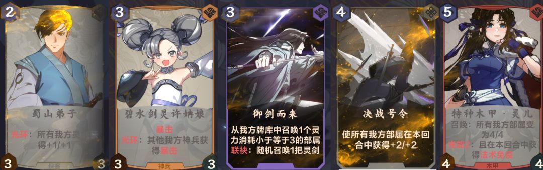 ·蜀山弟子本身的+1/+1效果能让己方灵剑扛过不少职业的【3费】打2aoe(火、阴、阳等),预判正确的话对于前期节奏有极大帮助。同时由于暴击飞剑的效果,他提供的+1攻击在50%的场合可以视作+2。