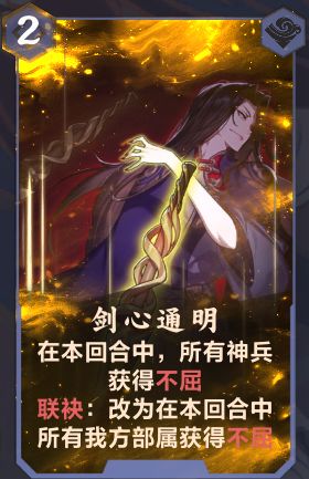·剑心通明是非常特殊的一张buff卡,对于保场面尤其是保护许姌娘有着非同寻常的效果。其BUFF对象【神兵】的范围包括了许姌娘以及沈岐召唤的4/4天剑,所以可以在首位直接使用而无视其苛刻的联袂条件(第二张卡才打,黄花菜都凉了)。注意不屈效果会被【燃烧】在回合末破解。