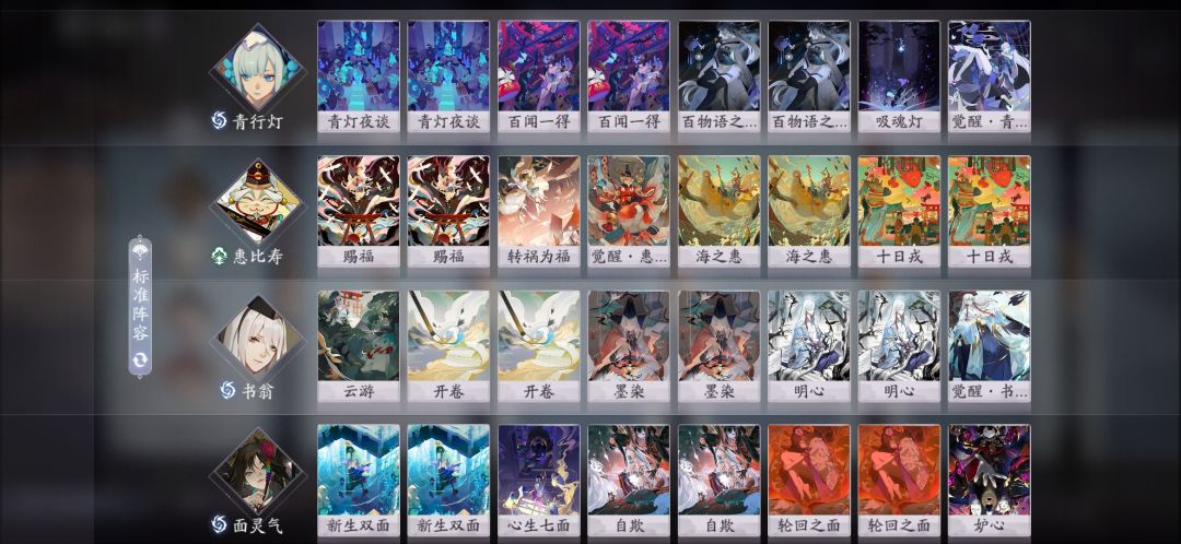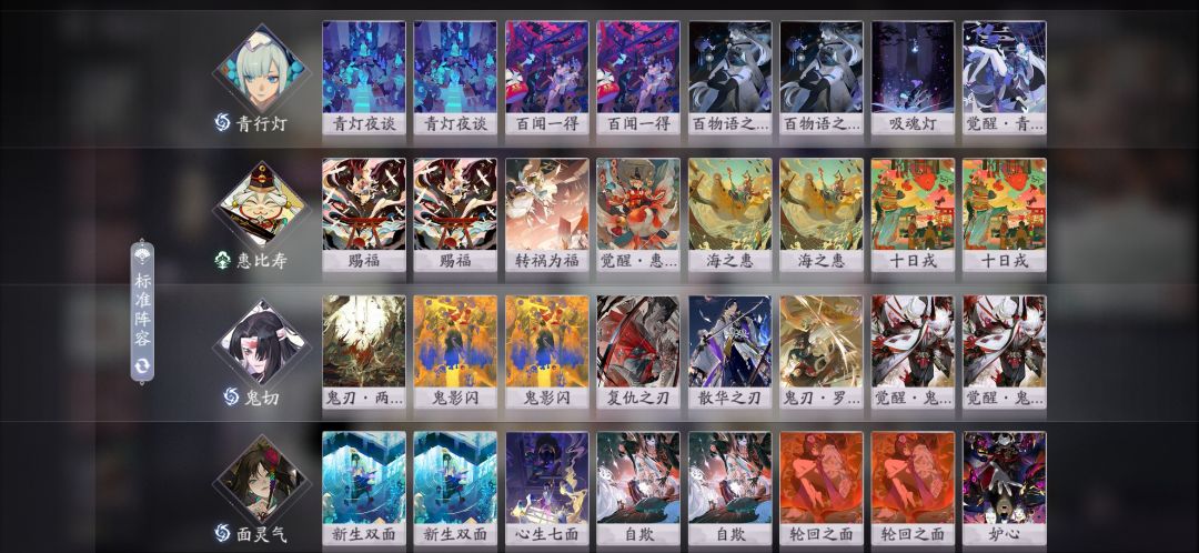 比如:青行灯+面灵气+惠比寿+书翁(百目鬼、鬼切等)